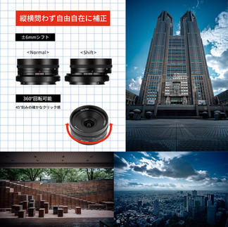 特徴:APS-C対応の広角シフトレンズ。ロータリーシフト機構(±6mm/360°回転・45°クリック)により、構図内の水平・垂直を整えつつ自然なパースで描写可能。約169g・直径63mmの軽量コンパクト設計。高屈折率レンズとEDレンズを組み合わせたレンズ構成により歪曲や色収差を抑え、周辺までクリアでヌケの良い描写を実現。日常スナップから実用撮影まで幅広く活躍。パノラマ合成で継ぎ目の少ないワイド画を狙う、商品撮影でパースを整えて形状を正確に見せる、室内・不動産の記録で限られたスペースでもまっすぐな線を保つ、ショーウィンドーや展望台などガラス越しの撮影でシフトにより映り込みを避けるといった用途で、意図どおりの“整った一枚”を手軽に実現。APS-C設計ながら無シフト時はフルサイズ機でも実用が可能です。※周辺の描写は機種・条件により異なります。